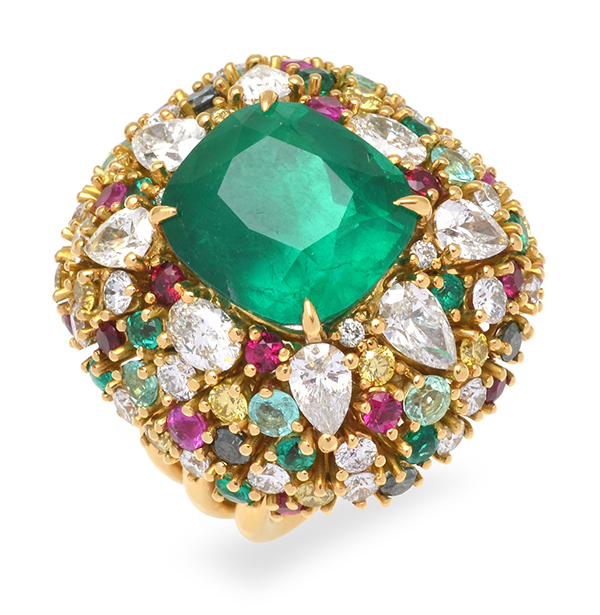 Of bombe design, centrally set with a cushion cut emerald of 9.32cts surrounded by oval, pear and round white brilliant cut diamonds totalling 4.30cts, highlighted by round cut rubies, emeralds, yellow and green diamonds, mounted in 18ct gold, ring size M.