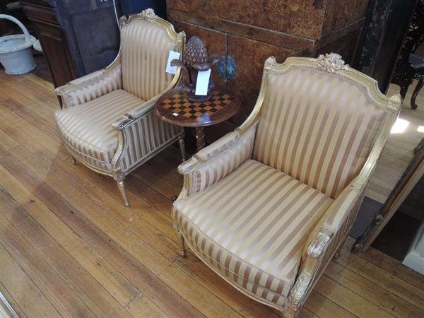 A PAIR OF BERGÉRES IN STRIPED UPHOLSTERY