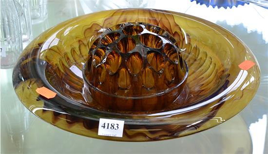 AN ART DECO AMBER GLASS BOWL AND ORIGINAL FROG