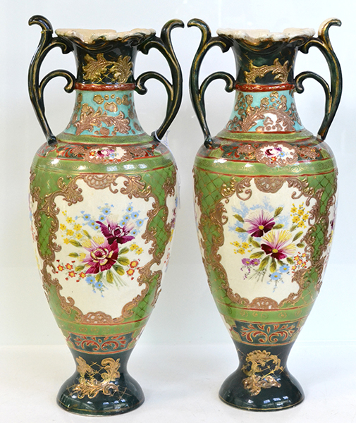 A PAIR OF 19TH CENTURY TWIN HANDLED VASES WITH FLORAL AND GILT DETAIL