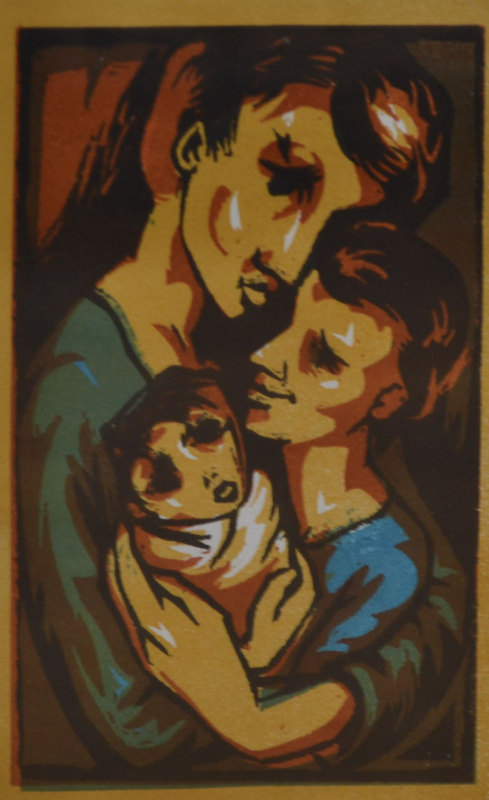 BILL COLEMAN, LOVING FAMILY, COLOUR LINOCUT, 20 X 12