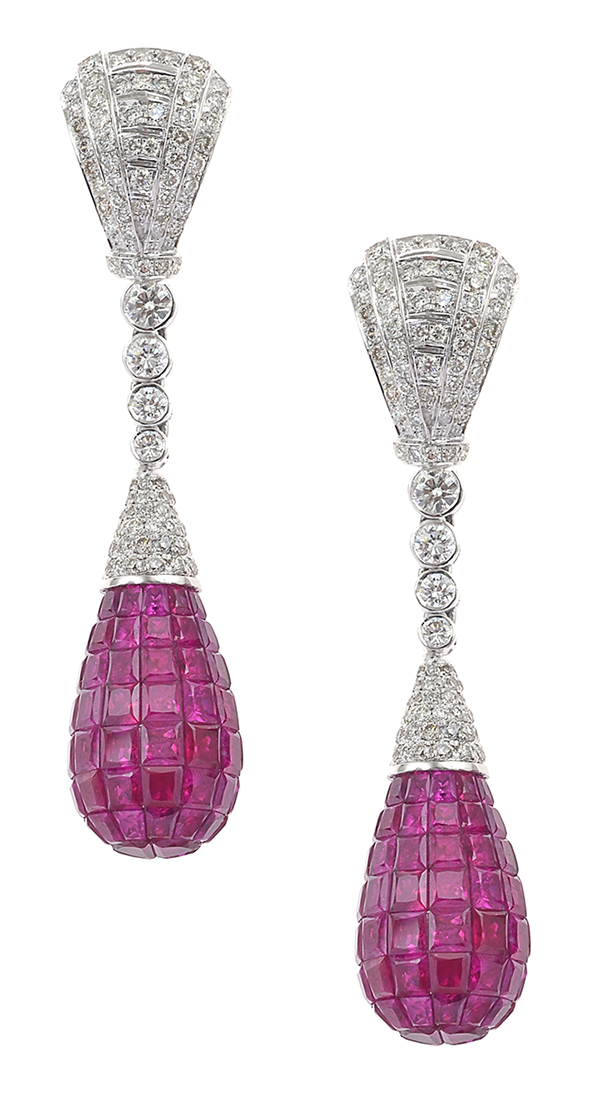 Each featuring a drop set with carre cut rubies and a pave set diamond cap, suspended from graduated round brilliant cut diamonds and a diamond set panel, all mounted in 14ct white gold.