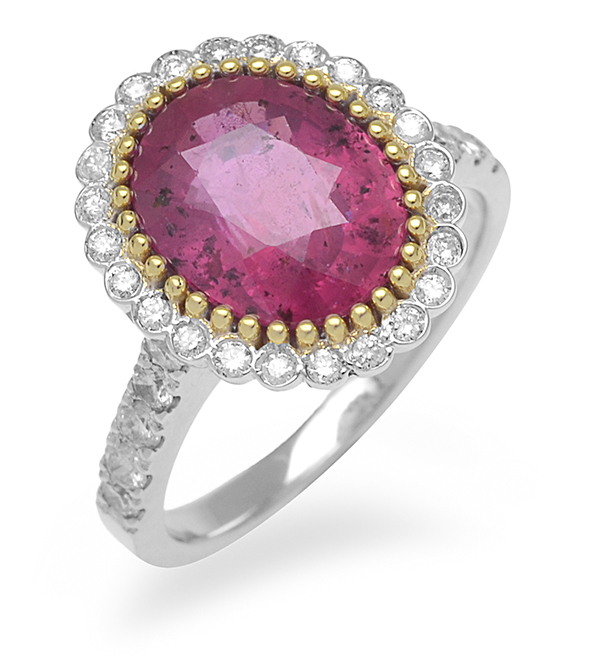 The oval cut ruby of 4.10cts surrounded by round brilliant cut diamonds, mounted in 18ct white and yellow gold, ring size M, accompanied by a GSL report stating ruby is natural and not heat treated.
