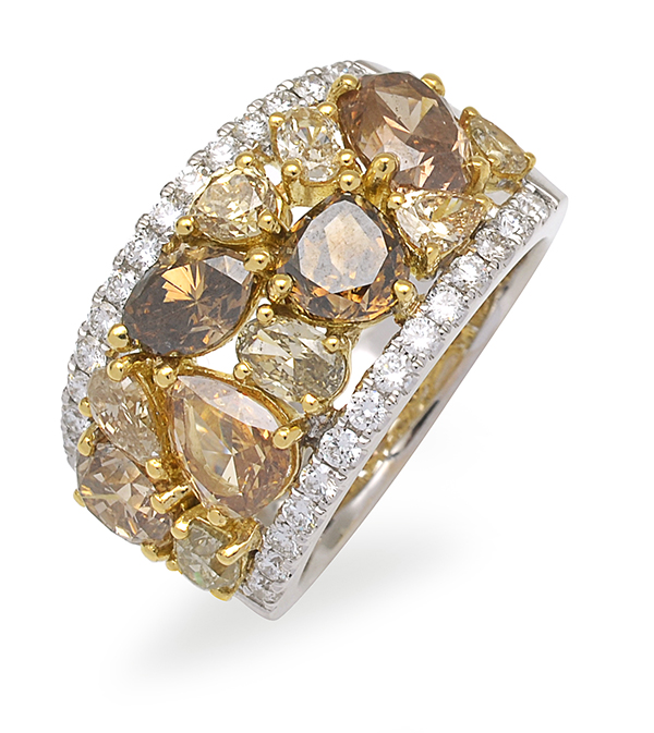 Featuring a panel of mixed cut coloured diamonds in hues of green, yellow and brown totalling 4.93cts, flanked by a row of round brilliant cut white diamonds, mounted in 18ct white gold, ring size M.