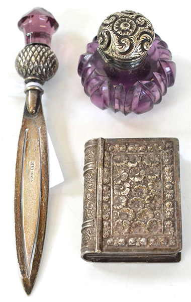 A COLLECTION OF 19TH CENTURY STERLING SILVER MOUNTED CURIOS, INCL. SCENT BOTTLE, FIGURAL SNUFF BOX ETC