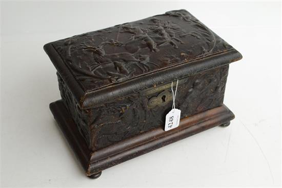 A VICTORIAN LEATHER MOUNTED VELVET LINED JEWELLRY CASKET, BEVEL-EDGED MIRROR & MANICURE ITEMS INSIDE, HUNTING SCENES TO EXTERIOR