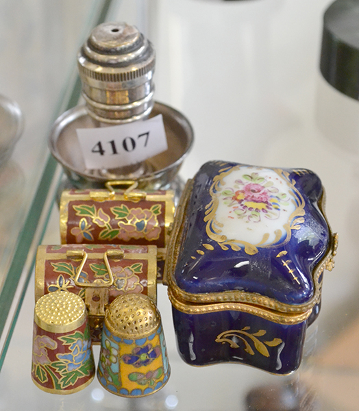 A COLLECTION OF CLOISONNE THIMBLES AND CASES, AND A PORCELAIN TRINKET BOX (LOSSES)