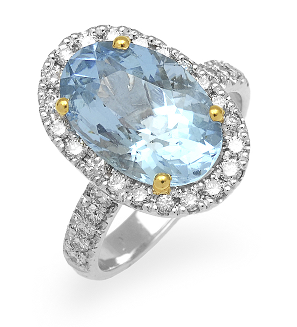 The oval cut aquamarine of 4.60cts surrounded by round brilliant cut diamonds, set in 18ct white gold, ring size L.