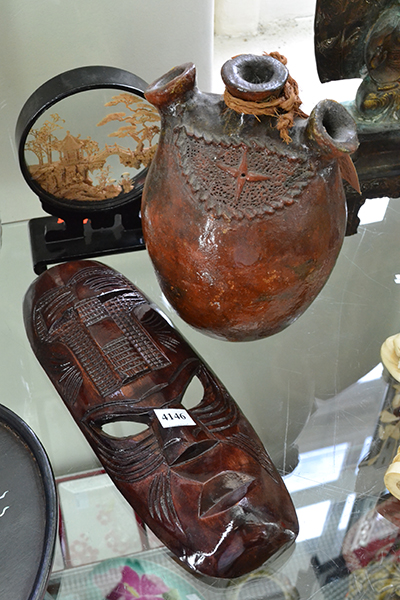 A JAPANESE CORK DIARAMA, STONEWARE BOTTLE & A MASK