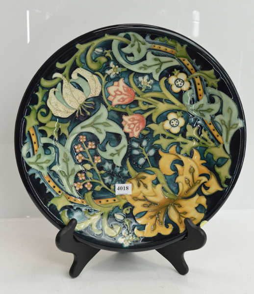 A large pottery plate with Golden Lily pattern on blue ground decorated by Sally Tuffin after William Morris, impressed factory marks and painted monograms, 35cm diameter