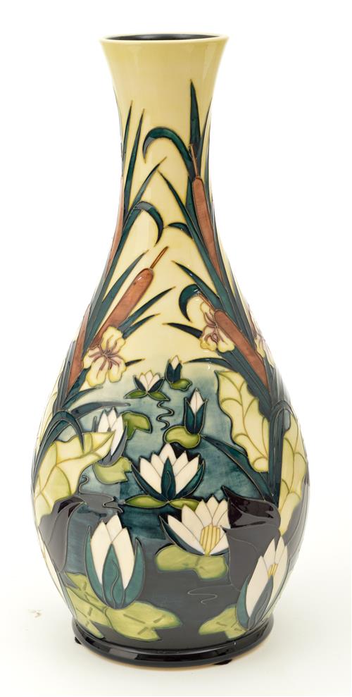 enriched with water lilies, cattils and rushes decoration on cream and green ground, designed by Rachel Bishop, impressed factory marks and painted marks, 42cm high