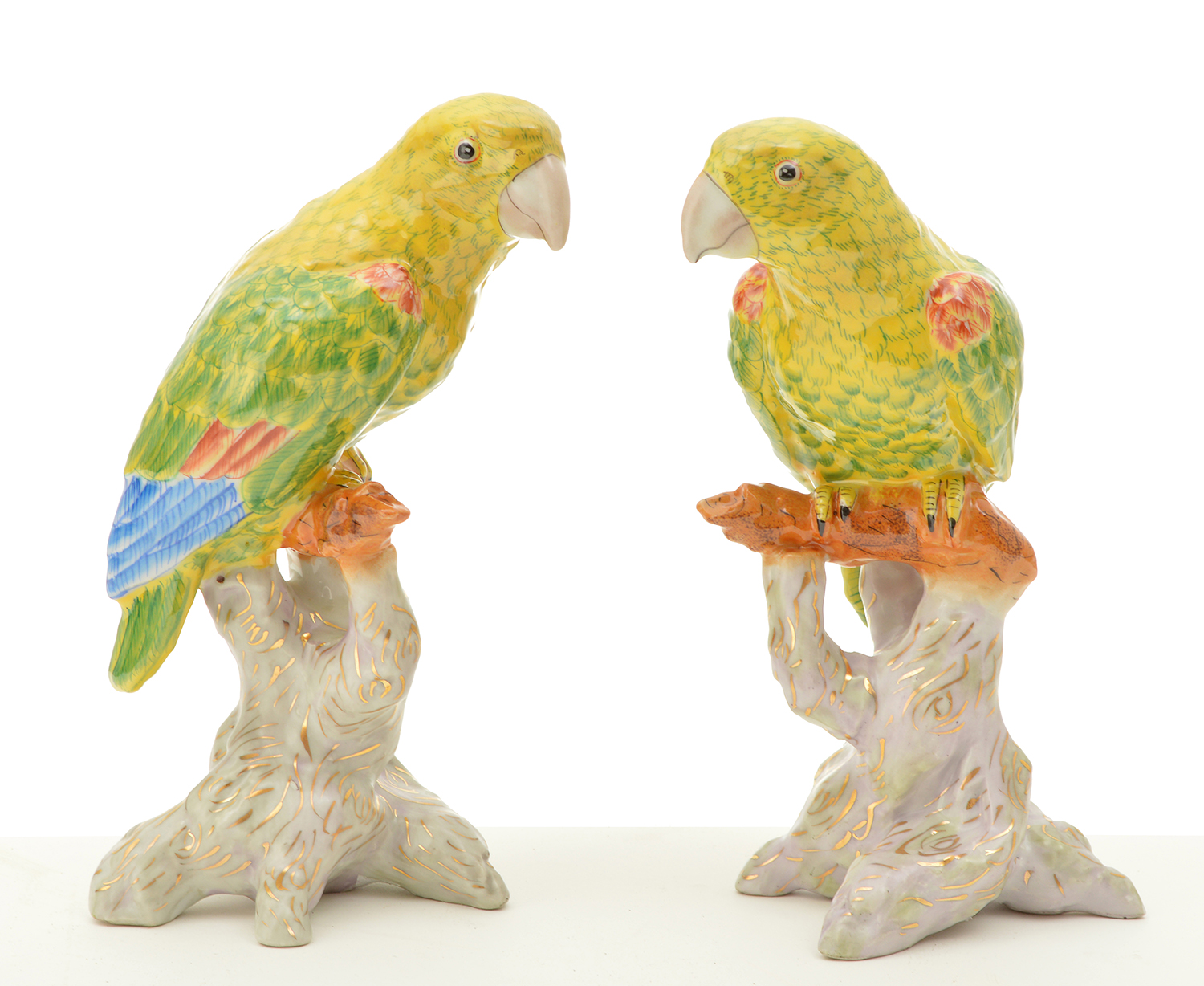 A PAIR OF POLYCHROME PORCELAIN PARROTS