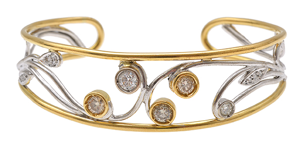 Of pierced design, set throughout with round brilliant cut white and champagne diamonds totalling 1.33cts, mounted in 18ct white and yellow gold.
