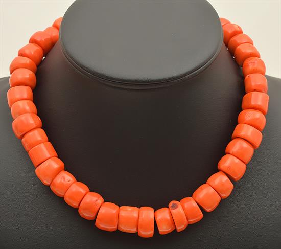 A DYED CORAL NECKLACE TO A BALL CLASP IN 9CT GOLD