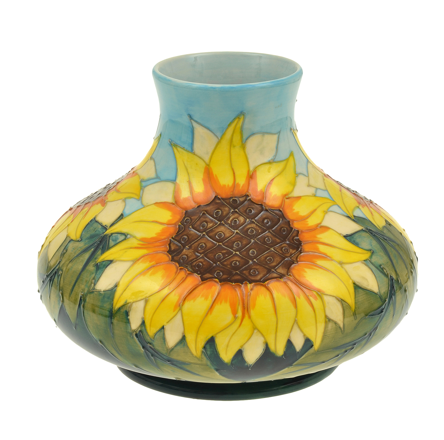 A MOORCROFT SUNFLOWER DECORATED COMPRESSED VASE