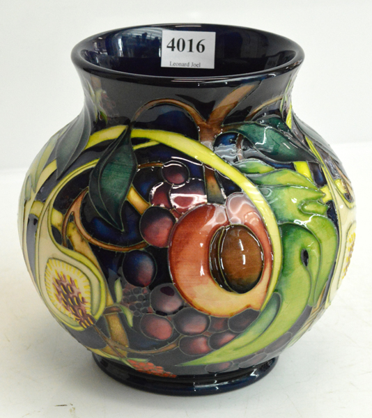 decorated with exotic fruits and foliage, reserved against a cobalt blue ground design by Emma Bossons, copyright 2000, impressed factory marks and painted monograms, 15cm high