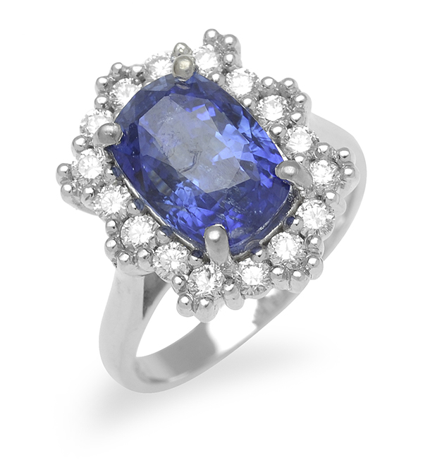 The cushion cut sapphire of 5.69cts surrounded by round brilliant cut diamonds, mounted in platinum, accompanied by a GIA certificate, ring size N.
