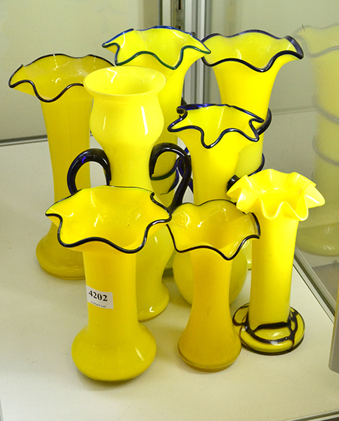 A QUANTITY OF ACID YELLOW ART GLASS, MOST WITH FRILLED EDGES