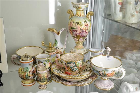 A COLLECTION OF CAPODIMONTE INCL. CUPS AND SAUCERS, VASES, PEPPER MILL AND SHAKER, ETC
