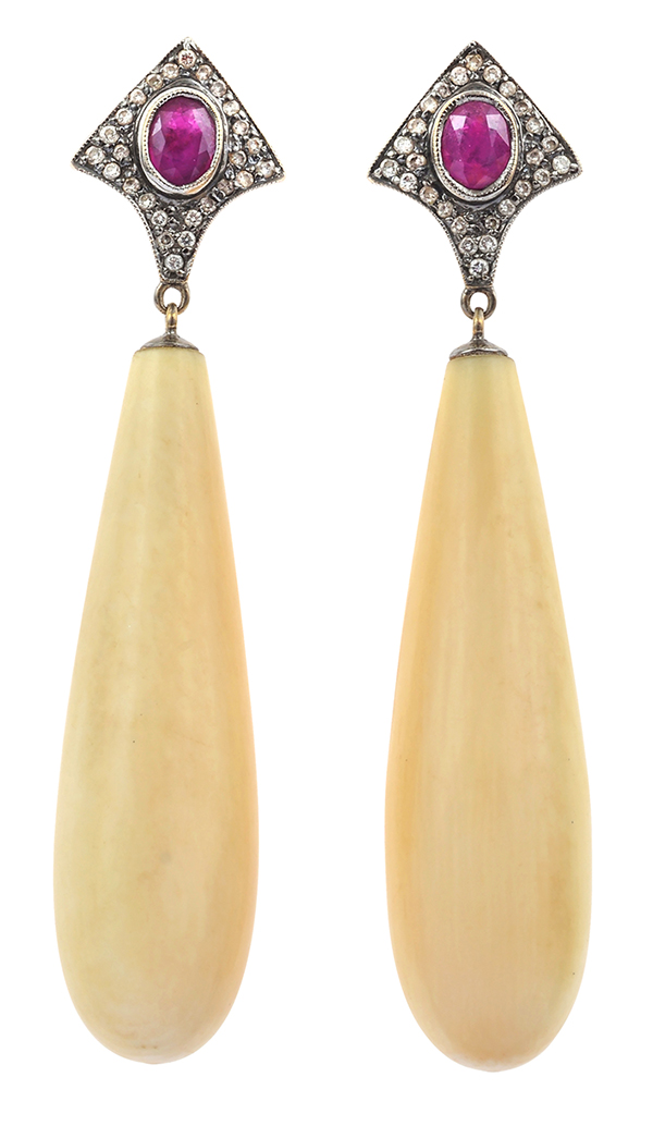 Each earring featuring a polished elongated drop of ivory surmounted by a ruby and diamond set geometric panel, mounted in silver.