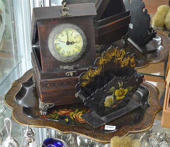 A PAPIER MACHE TRAY & LETTER HOLDER (MINOR LOSSES) ALONG WITH A BOXED CLOCK
