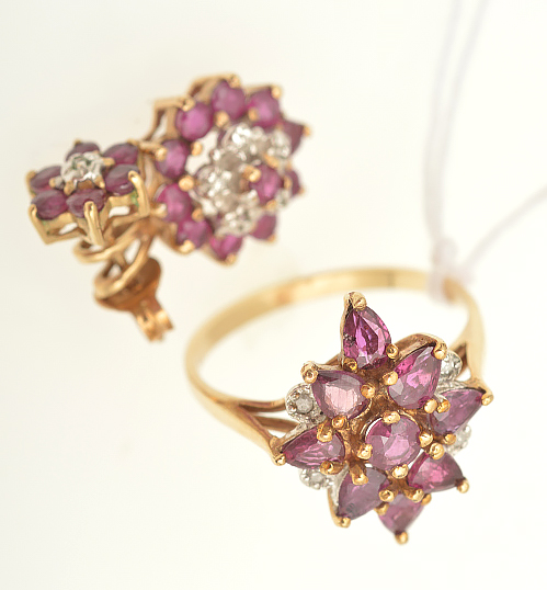 A COLLECTION OF JEWELLERY INCLUDING A RUBY AND DIAMOND RING, PENDANT AND SINGLE STUD EARRING ALL IN GOLD