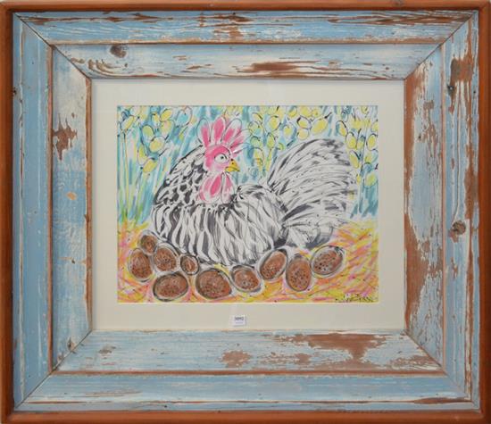 BELINDA FRASER, A PAINTING OF A HEN IN A RUSTIC LIGHT BLUE FRAME, WATERCOLOUR, 38.5 X 51CM
