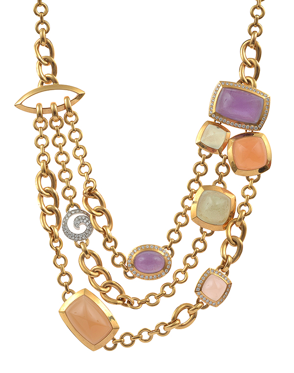 Featuring three graduated rows of fancy link chain featuring gem set panels of fancy cut diamond, amethyst, rose quartz, carnelian and prehnite, set in 18ct gold, total length 420mm.