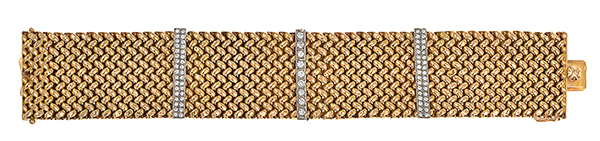 Of woven design, overlaid with three diamond set rectangular panels, all mounted in 18ct gold, total length 210mm.