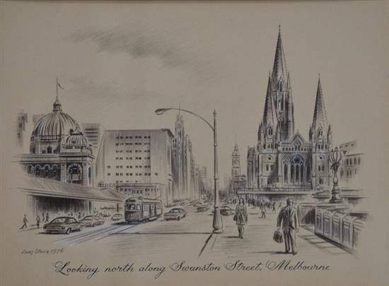 JOAN STORIE, PAIR OF MELBOURNE STREET SCENE, PENCIL AND GOUACHE