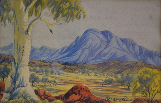OSCAR NAMATJIRA, CENTRAL AUSTRALIAN LANDSCAPE, WATERCOLOUR, 17 X 26CM