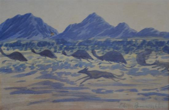 EDWIN PAREROULTJA, CENTRAL AUSTRALIAN LANDSCAPE WITH RUNNING EMUS, WATERCOLOUR, 17.5 X 25CM