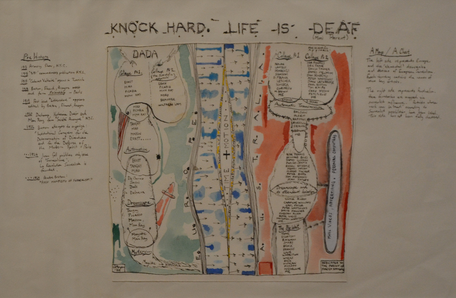 JON CATTAPAN, KNOCK HARD, LIFE IS DEAF 1989, INK AND WATERCOLOUR ON PAPER, 36 X 56CM, REPRODUCED IN TENSION MAGAZINE 1989 AND JON CATTAPAN: POSSIBLE HISTORIES 2008, P. 91