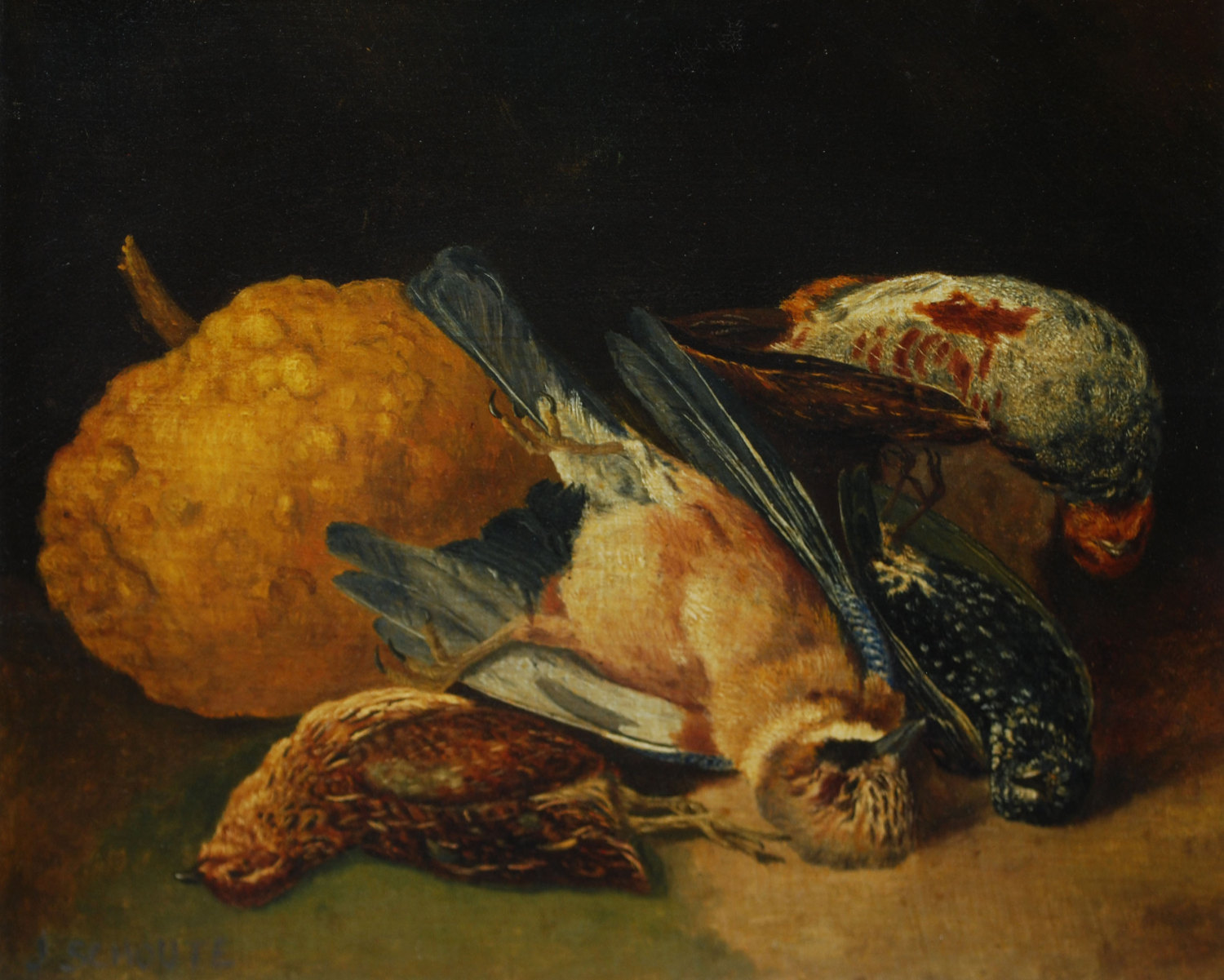 J. SCHOUTE, STILL LIFE WITH GOURD, PAINTED AFTER JAN FIJT, OIL ON CANVAS, 24 X 30CM