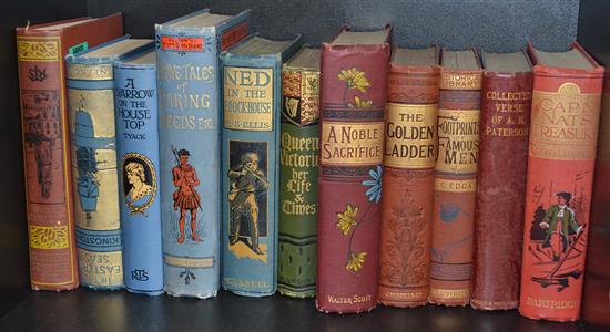 A SHELF OF DECORTIVELY BOUND VINTAGE HARDBACK, INCL. 'BRAVE TALES OF DARING DEEDS', AND 'BED IN THE BLOCK-HOUSE'