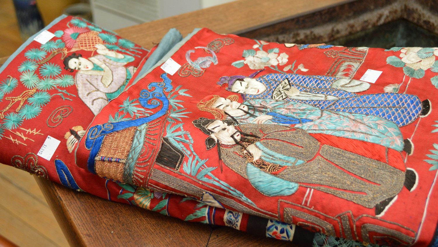 Oblong rectangular in form, each depicting a court scene, with a peonie border and a fringed hem