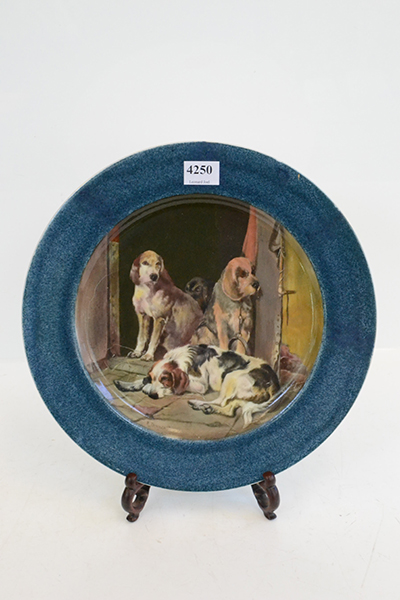 A 19TH CENTURY ENGLISH PORCELAIN CABINET PLATE WITH A DOG THEME, SIGNED E. TOWNSEND (REPAIRED)