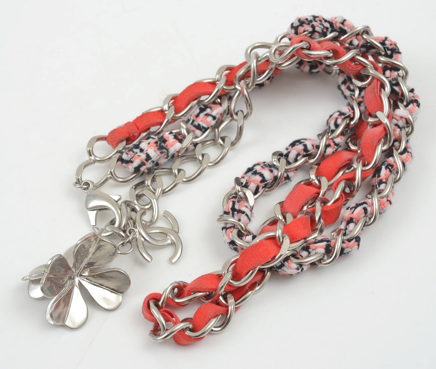Styled in red, pink and black tweed and and pink suede, woven through a white metal metal chain with clover charm, stamped 2014.