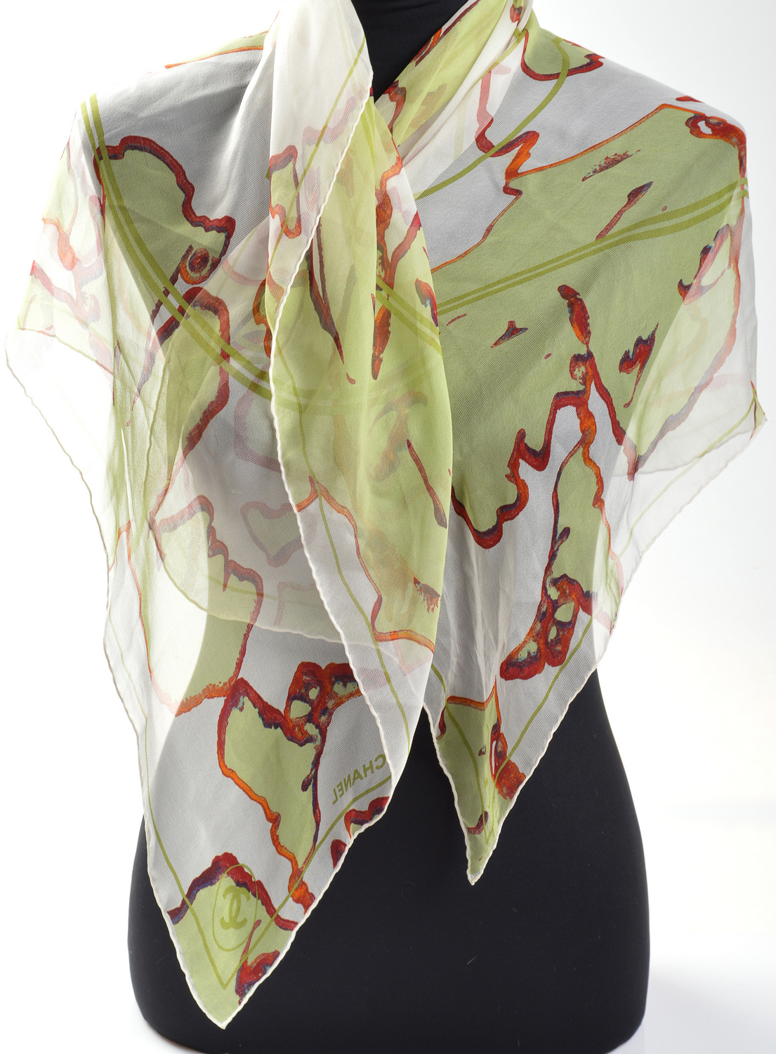 The sheer scarf styled in green and orange, on an ivory background, 89cm square, with box.