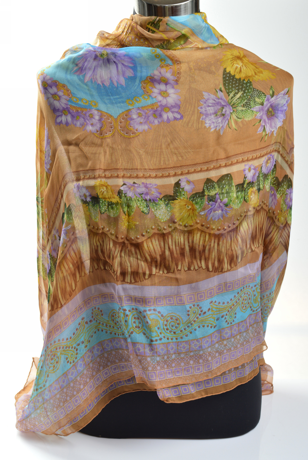 The sheer shawl styled with a floral design in multi colours, 132cm sqaure.