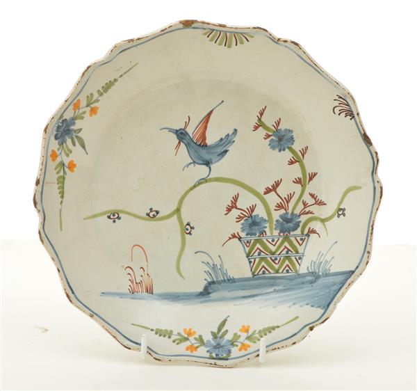 earthenware plate with hand painted bird and floral motifs in colours of blue, yellow, green and brown, (minor chips to the rim), 22.5cm diameter