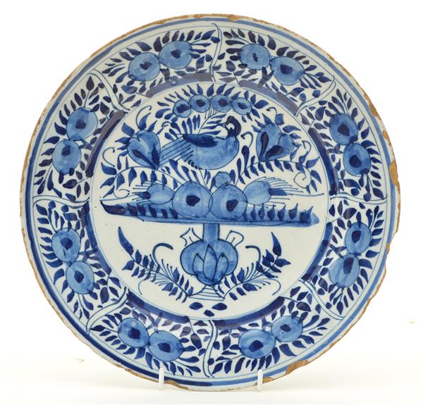 tin glazed earthenware plate hand painted underglaze in blue with stylised floral and fruit and bird motifs, (losses to the rim) 29.5cm diameter
