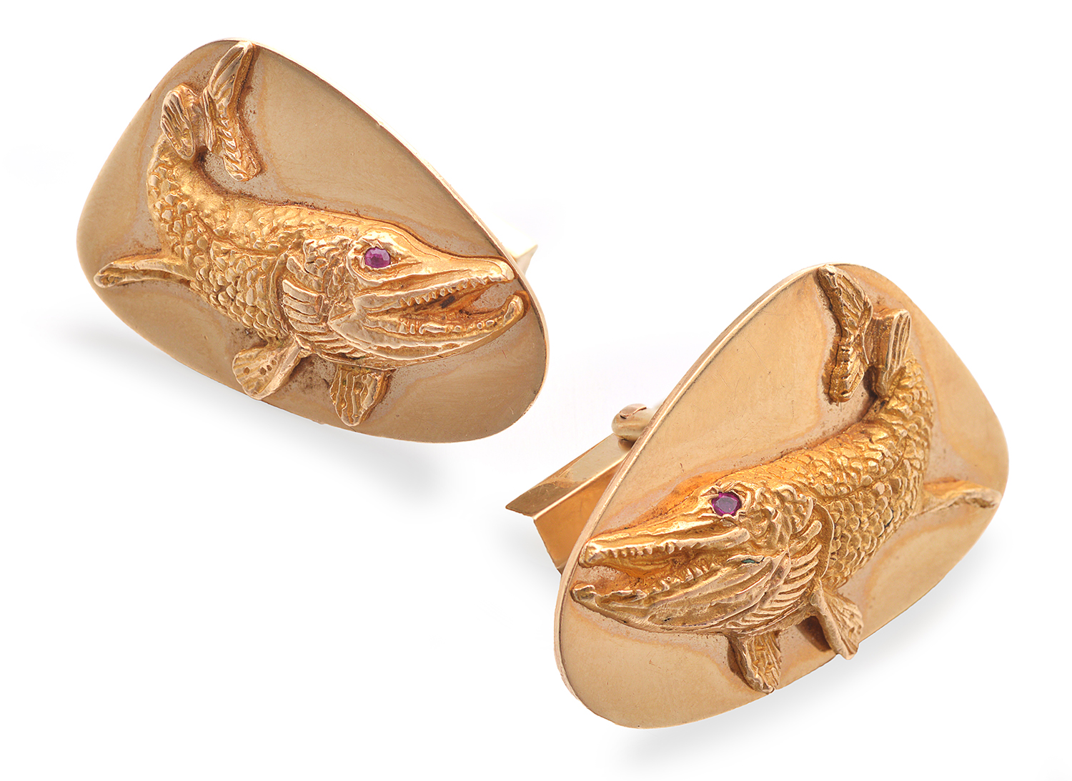 Each panel having an applied hand carved fish with a ruby set eye, signed, in 14ct gold.