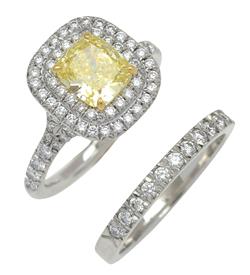 The cushion cut fancy intense yellow diamond of 1.01cts, surrounded by a double row of round brilliant cut diamonds, together with a matching diamond band, all mounted in platinum and 18ct white gold, ring size G-H, accompanied by original Tiffany certificate and box.
