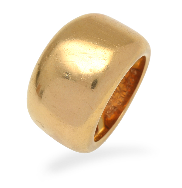 The domed polished band modelled in 18ct gold, signed, ring size J, boxed and with papers.