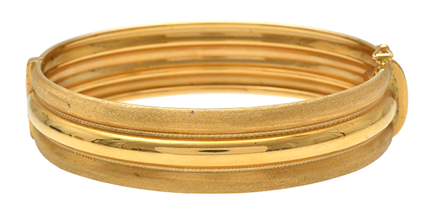 The oval hinged bangle of reeded design with polished and brushed finish, in 18ct gold.