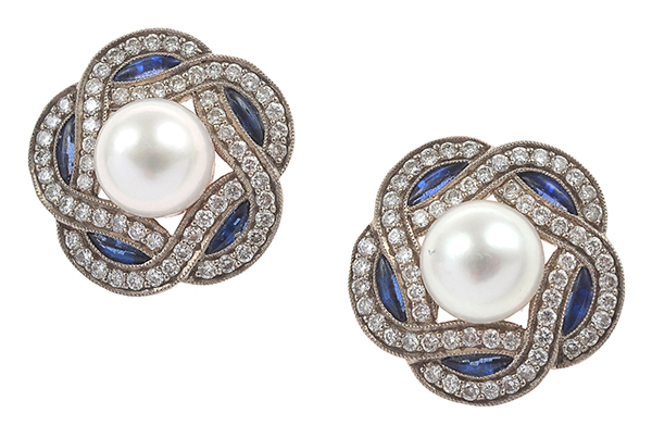 Each earring featuring a round cultured pearl of silver and white hues measuring 7.80mm, centrally set above a circular woven panel set with round brilliant cut diamonds and marquise cut sapphires, mounted in 18ct gold.