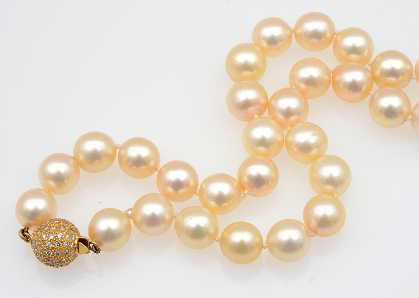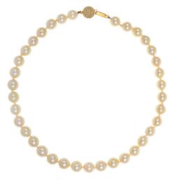 Comprising thirty six round pearls of cream and pale yellow hues measuring 9.50mm - 9.95mm to a diamond set ball clasp, total length 410mm.