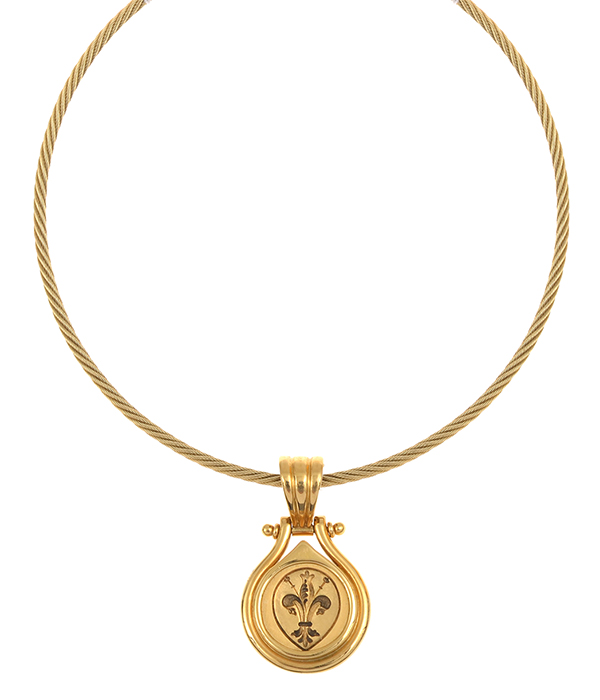 The circular pendant-enhancer set with a fleur de lys panel, suspended from a thick wirework collar, all mounted in 18ct gold.