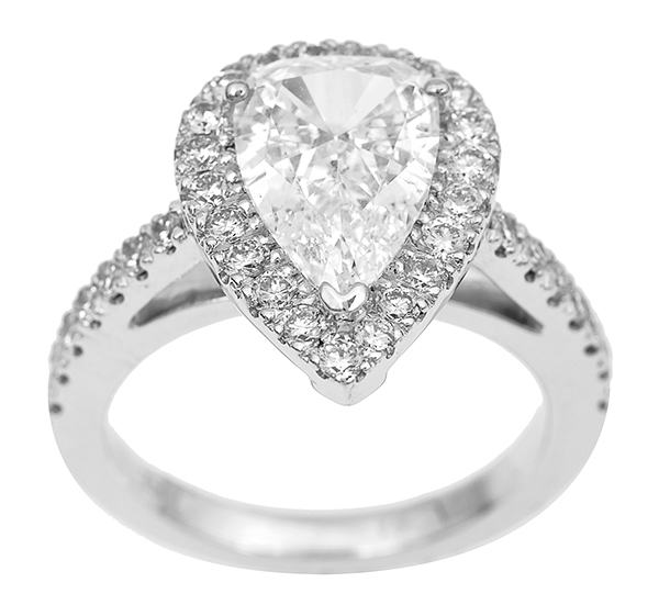 Featuring a pear cut diamond of 1.90cts surrounded by round brilliant cut diamonds, set in 18ct white gold, ring size K.